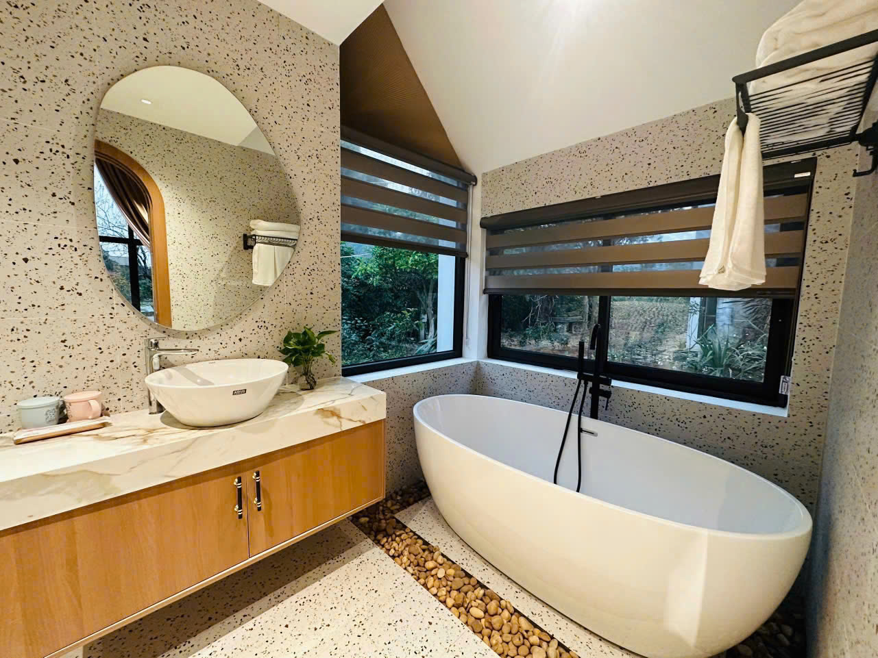 - Mỗi Bungalow có 01 phòng ngủ 01 giường 1.8m +1 sofa bed 1.9m, nhà vệ sinh khép kín có bồn tắm hiện đại